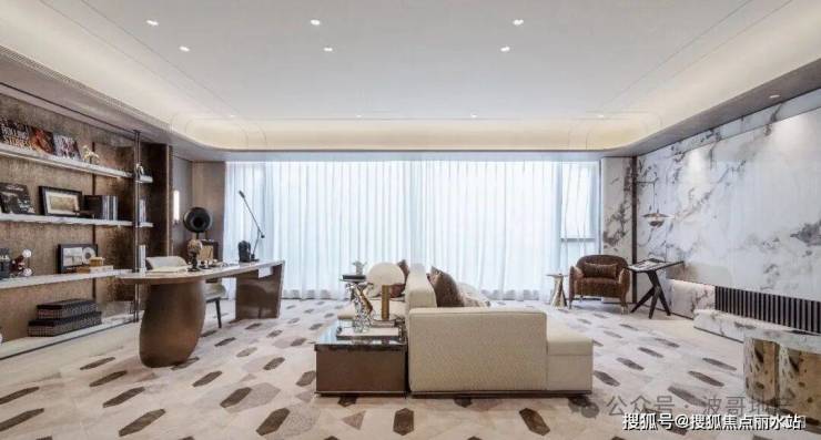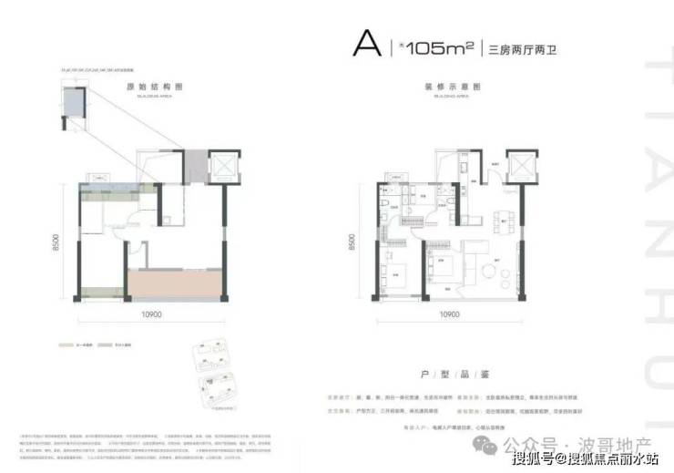 A105㎡三室两厅两卫:此户型分布在3/6/7号楼中间户,超高层户型三梯四户布局,每一户均有独立电梯前室,三开间朝南,动静分区设计,整体户型开间(宽)约10.9米、进深约8.5米,通过阳台、飘窗、设备平台拓展等,整体户型得房率约在97%。
