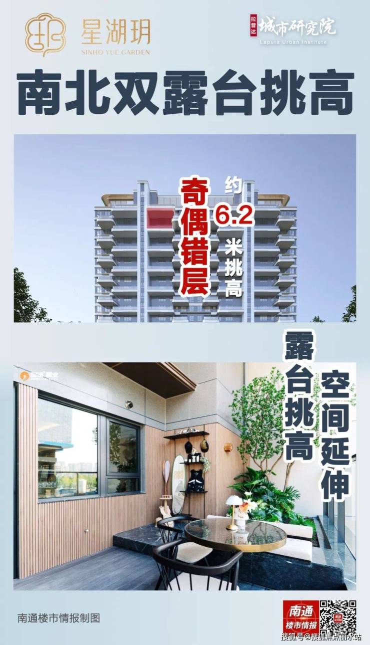 ■ 颠覆性的产品设计: 作为南通罕见的四代住宅,星湖玥以错层挑高露台和超高实得率,实现“空中庭院”的居住理想。
