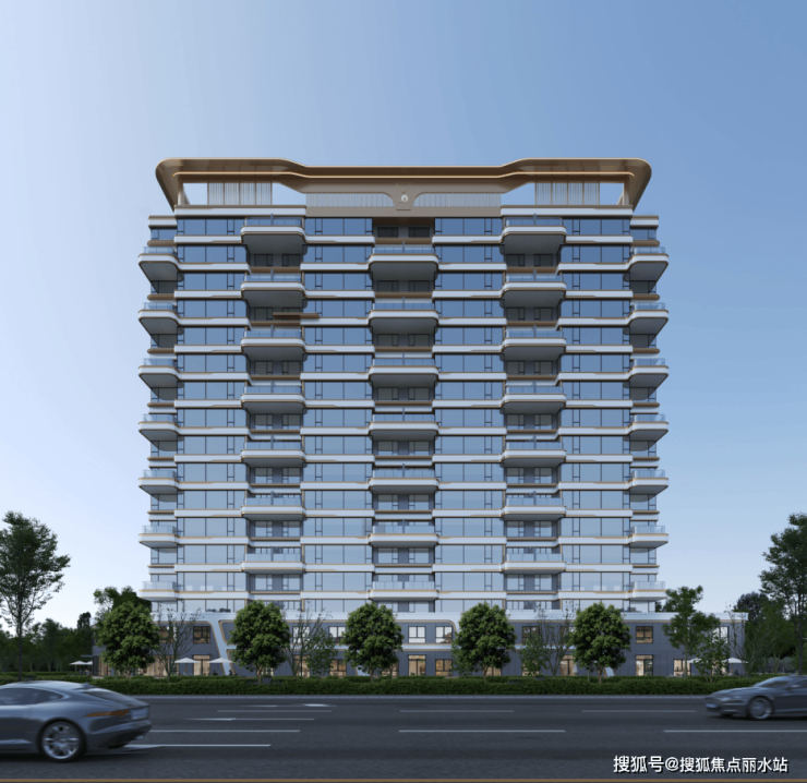 为了与蜿蜒的星盛湖岸遥相呼应,星湖玥在立面上大量运用香槟金+高级灰等富有金属质感的材质组合,铝板+保温一体板+大面积玻璃,勾勒出湖畔奢宅的肌理。