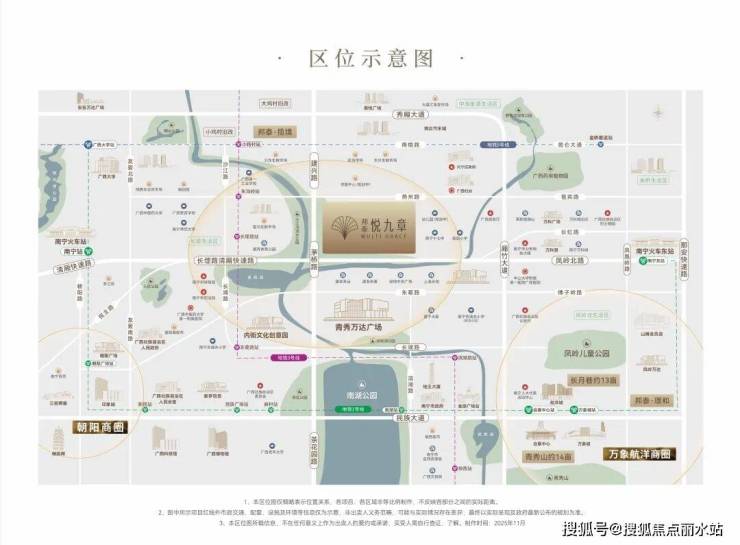 建兴路(在建中)向南约1.2公里 开车约3分钟直达东葛,约1.7公里 开车约5分钟直达青秀万达;约2.2公里 开车约8分钟轻松畅达总面积约200公顷城市核心生态配套——南湖公园。