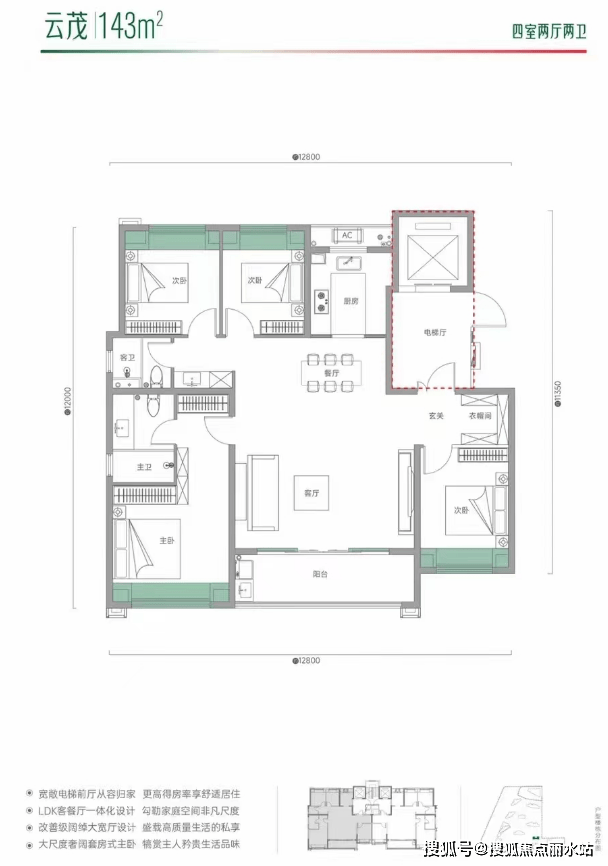 根据户型分布平面图来看,该户型所在楼栋为3梯4户格局,双连廊设计,该户型位于楼栋边户,南北通透,三开间朝南,南向有连接次卧和客厅的大阳台;户型比较方正且动静分区较好,但是过道有点浪费面积,另外根据户型图显示,该户型可以做到一梯一户的居住体验。
