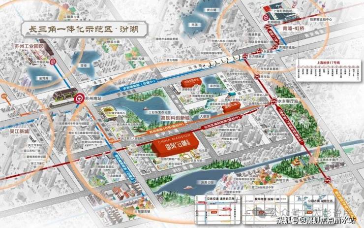 苏州南站位于长三角一体化先行启动示范区核心——汾湖,沪苏湖高铁、通苏嘉甬双高铁于此十字共站,预计2025年建成通车,实现由汾湖8分钟到松江,20分钟到虹桥;上海17号线、苏州10号线、嘉兴3号线两省一市三地铁经行,一站串联上海、苏州、杭州三大国际都市圈。