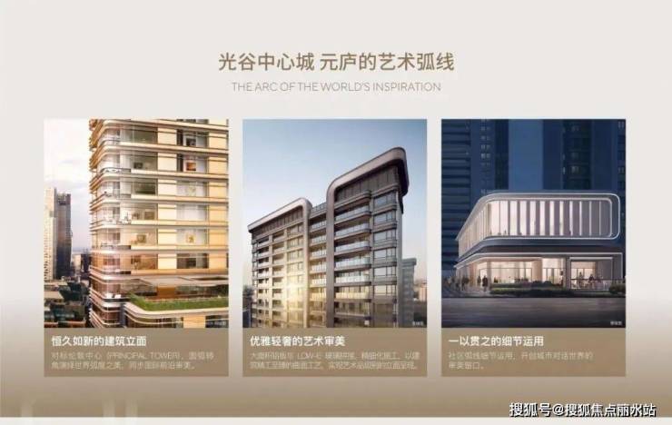 2、艺术弧形立面:国内一线建筑设计机构,詹天佑奖获得者:承构建筑,以伦敦伦金中心为艺术灵感,采用哑光香槟金铝板、大面积玻璃、石材等品质用材,以及弧形转角、凹槽切割等严苛工艺,打造富有豪宅辨识度的高颜值立面,铝板防雨水流挂腐蚀,历久弥新可保障二手房的增值溢价。
