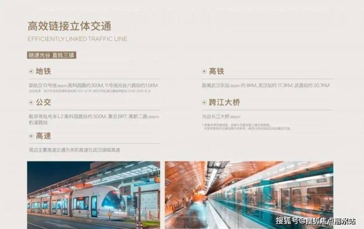 三横四纵”交通路网(三横:高新大道、高新二路、高新三路;四纵:光谷四路、光谷五路、光谷六路、光谷七路)。紧邻有轨电车L2线高科园路站,有轨电车与地铁11号线无缝换乘;规划13号线紧临项目预有站点;