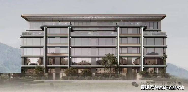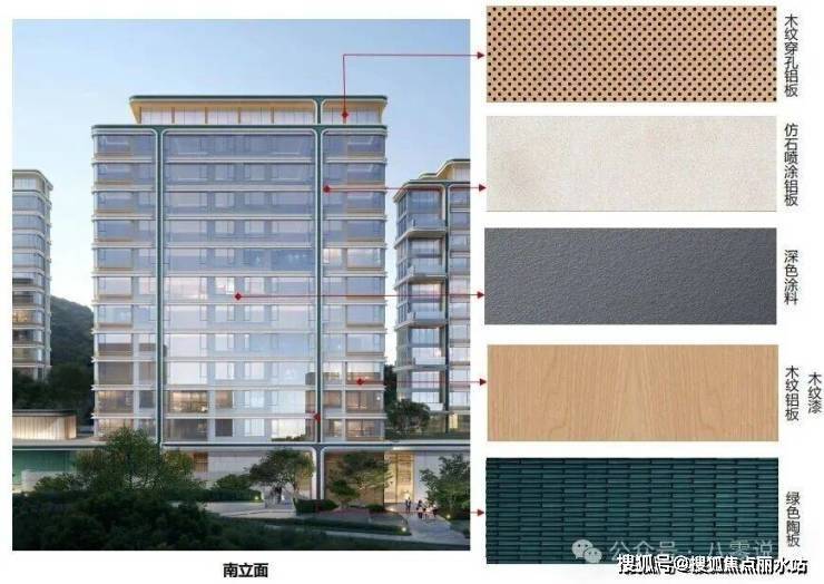在建筑语言上,璞逸世园更是首次将陶板、木纹铝板、仿石铝板组合运用于建筑外立面,加上向上生长的写意和非对称呈现,赋予了公建化外面更多的自然质感。
