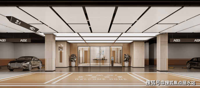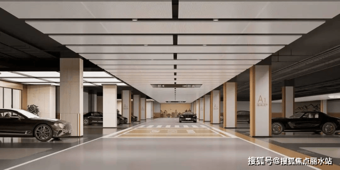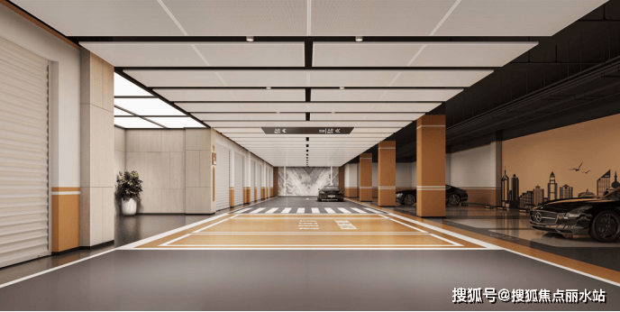 在车库车道顶部,海尚府采用铝扣板吊顶,不仅美化顶部,还隐藏各种管道,减轻压迫感,增加空间的层次感,提升空间韵律变化,呈现秩序之美。