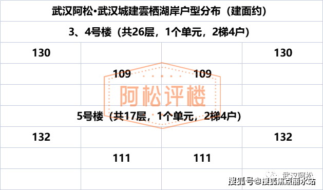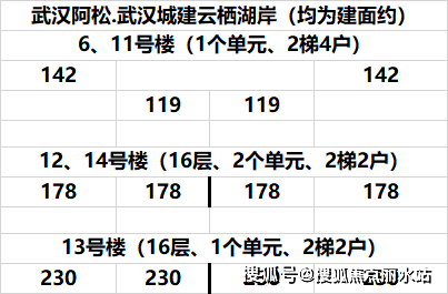 其中3、4、6号楼均为26层,5号楼共17层,11号楼共23层,均为1个单元,2梯4户,包含建面约109-142平房源;12-14号楼均为16层,2梯2户,12、14号楼2个单元,13号楼1个单元,包含建面约178-230平房源;另有建面约139-227平别墅在售。