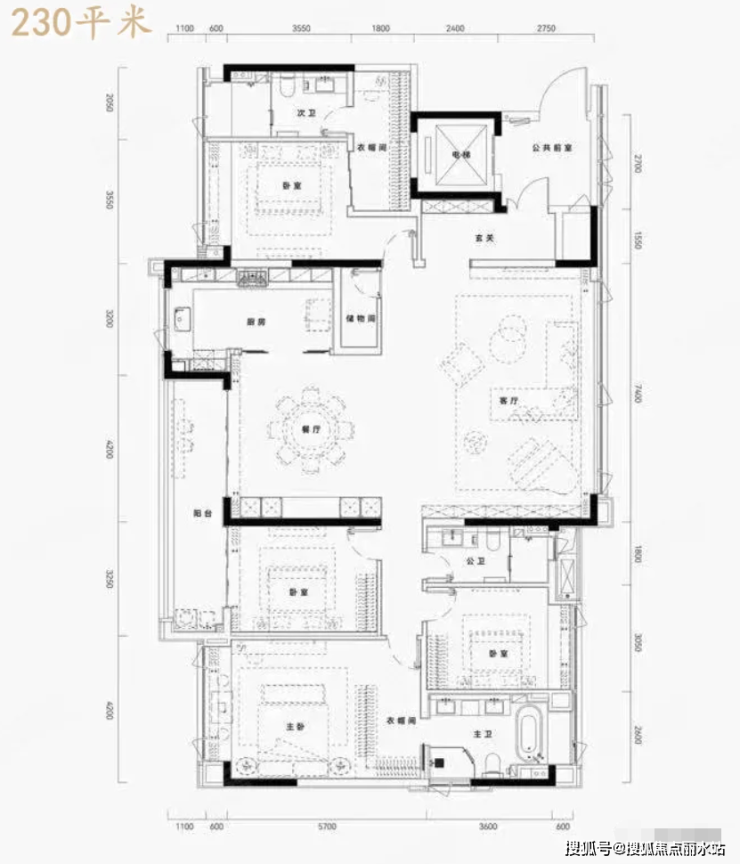 建面约230平 四房两厅三卫:板楼户型,南北通透,2.5开间朝南,三面采光,户型内光线很好。