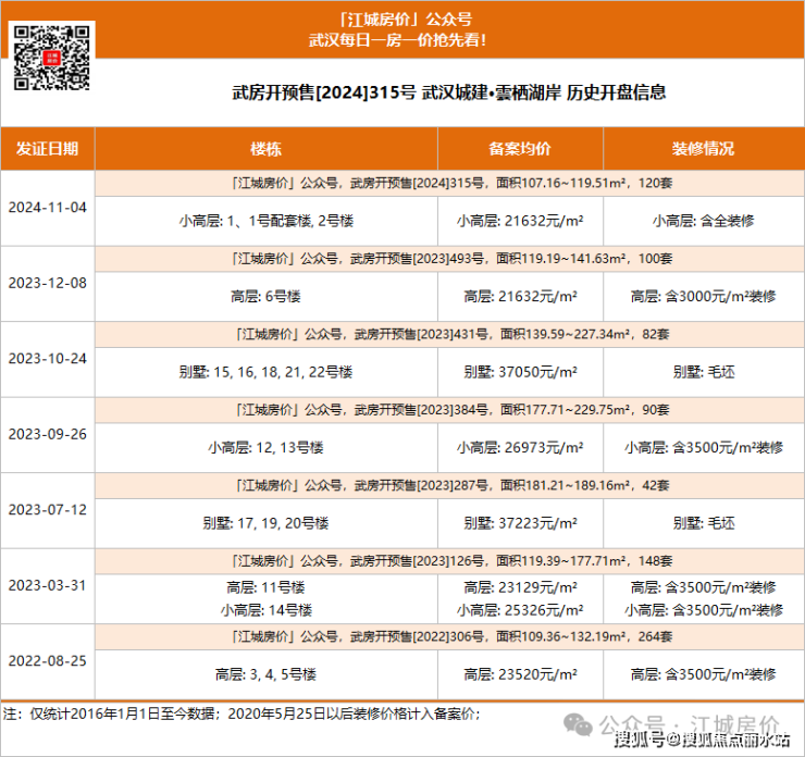 武汉城建云栖湖岸房源包含高层、小高层和别墅,整体备案价一直都很高,自2022年8月首次拿证以来,备案价有一些波动,但整体备案价依旧在2.1万元/平以上。