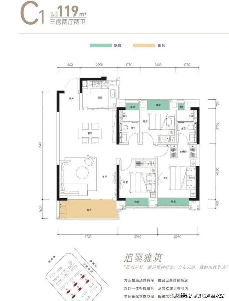 建面约119平 三房两厅两卫:连廊中间户,北边对连廊,可局部通透但北边私密性有一定影响。