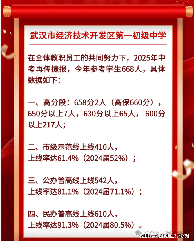 经开一初更是经开区公认的塔尖公立初中,每一年的普高率、示范率在全市排名都很靠前,2024年普高率突破了70%,2025年普高率直接突破80%!