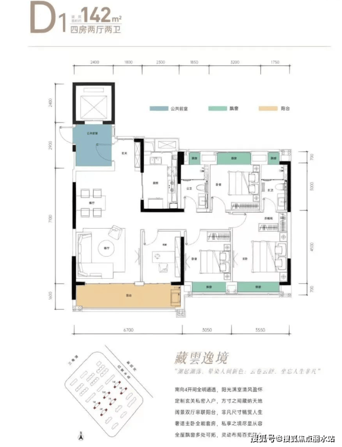 建面约142平 四房两厅两卫:南北通透边户,四开间朝南,南向大阳台,户型方正且动静分区。