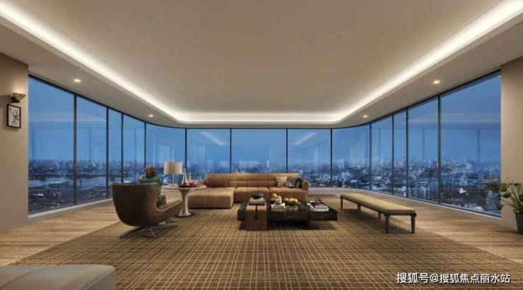 不得不感叹开发商的大胆超前,直接打破完整玻璃盒子的概念,有种 “人在厅中坐,景从四面来” 的沉浸体验。