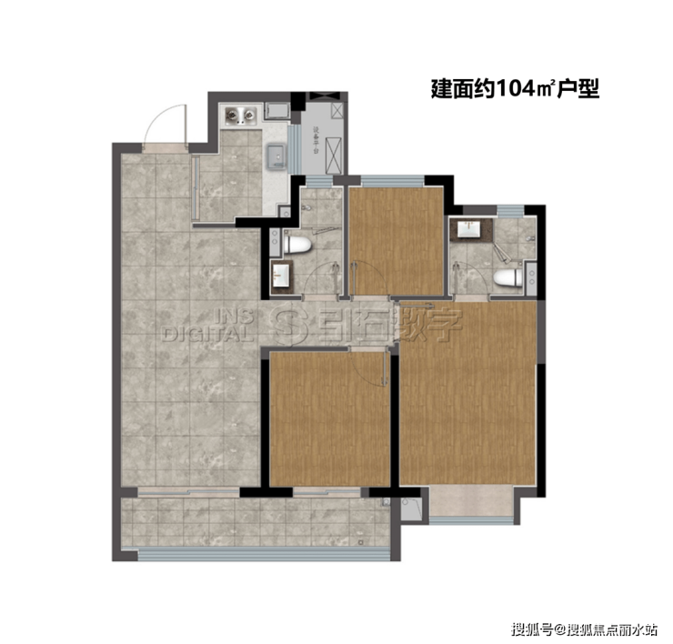 建面约104㎡户型,三开间朝南,阳台尺度约6.5m,南向两个卧室尺度均超过3m,居住舒适度高。