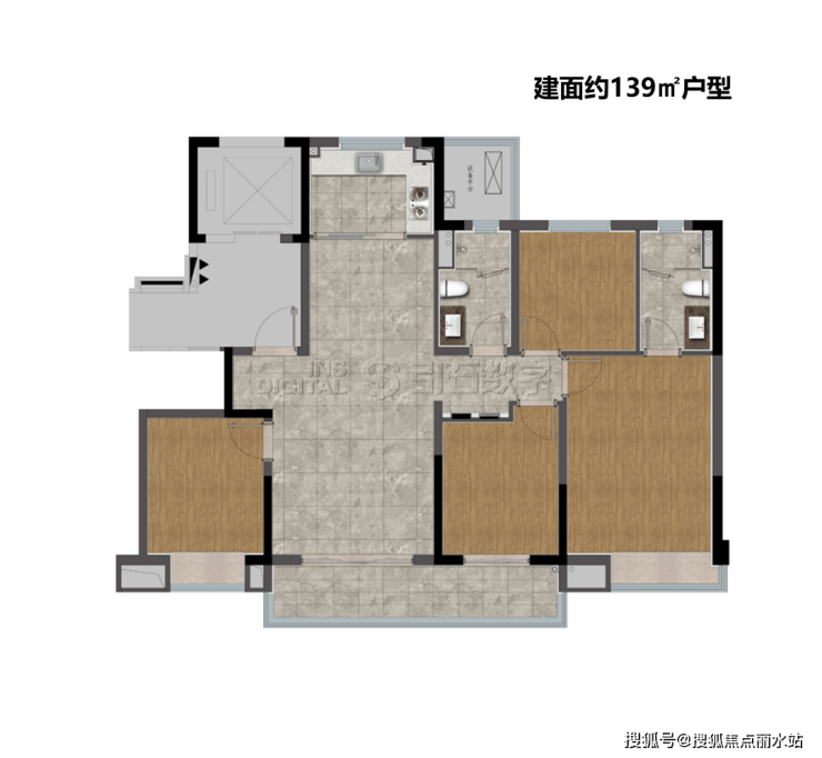 建面约139㎡户型,准一梯一户设计,四开间朝南,阳台尺度超过7m,每个房间开间均在3m及以上,得房率相对较高,尺度阔绰。
