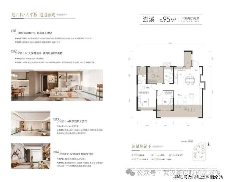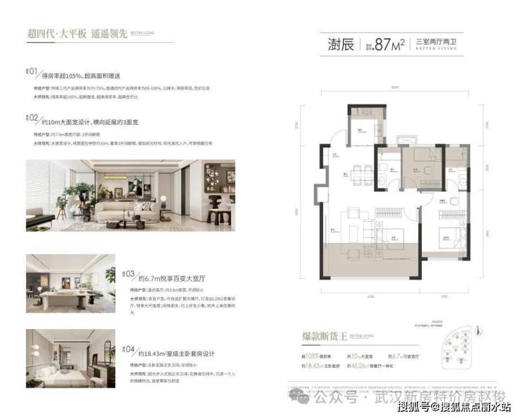 【超新质·超四代建筑大平板】 公建化立面 现代C型美学之作 特邀PTA上海柏涛,澳大利亚柏涛(墨尔本)中国合作单位,以至高水准匠造大师级立面——公建化外观,大窗墙比;大平板户型,较汉阳同面积段,面宽超15%——超四代户型:负公摊+超四代住宅大平板,得房率超105%+——户型设计,3LDK以上量级空间设计