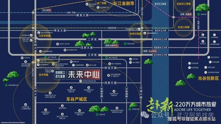 招商·武汉城建未来中心,由央企招商蛇口与国企武汉城建联袂巨献,布局武汉经开腹地,以柔性城市、幸福社区、热爱邻里三大核心理念,打造集居住、教育、商业、医疗、商办等于一体的220 万方未来幸福生活样板 ,为城市更好的未来而来。