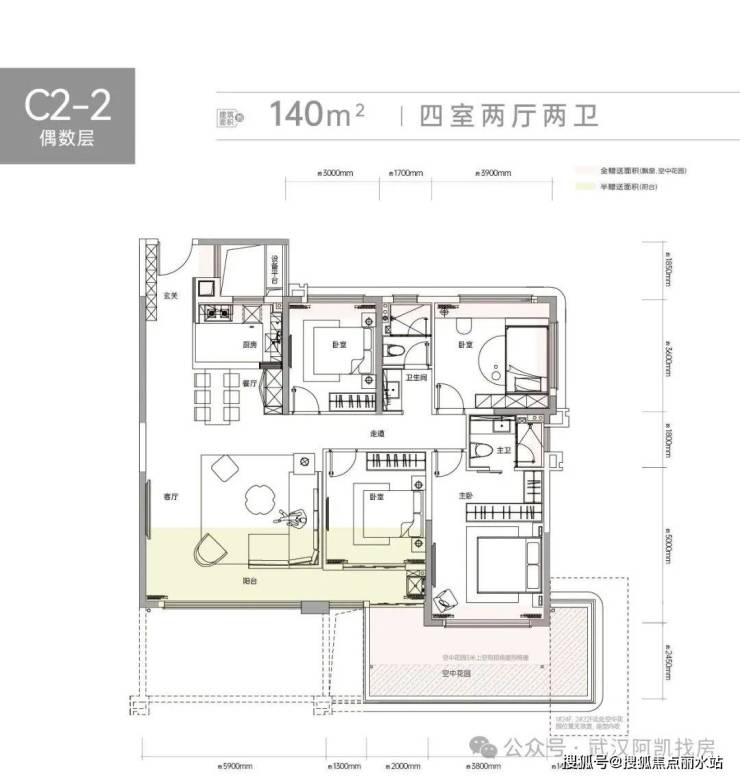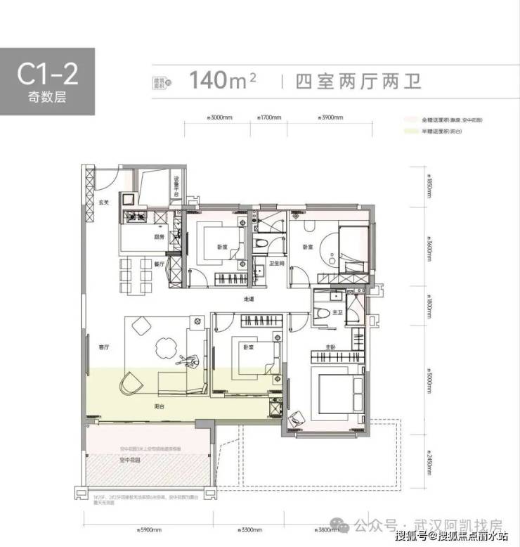 C2揽境在售建筑面积约107-140㎡三室、四室户型。