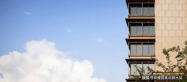 香槟金只是示例,在建发·缦云之上,建发房产探索了诸多经典的当代表达,在建筑立面上,以江南建筑中粉墙黛瓦的构造形式,构筑白色山墙系统,每层均采用通透大玻璃面,周边一圈窗框以金属线条勾勒,每层的窗框上方都饰以一处外挑飞檐,窗框外部则转译了撺檐杆,通过材质和形态的交叠,层层递进出中国建筑的华美之感。
