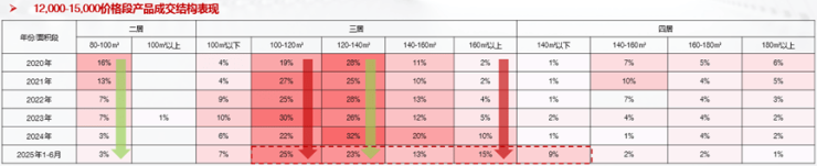 新发展模式下,改善和刚需“分道扬镳”。改善市场的份额逐渐突出,产品结构集中度增强,100-140㎡为主力面积段,160㎡以上产品占比增加,以三居产品为主力,未出现一居二居产品。