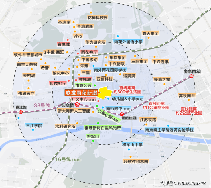 项目一街之隔,是在建的社区中心和已经招生的南师附中数字城学校;直线距离约500米内,有S3号线铁心桥站,2站南京南站,3站河西;直线距离约1公里内,有世茂52+、楚翘城、雨花客厅、宜悦城等旗舰商业天团;直线距离约2公里内,科技大厂环绕,充满科技与活力,为南京发展注入动能。