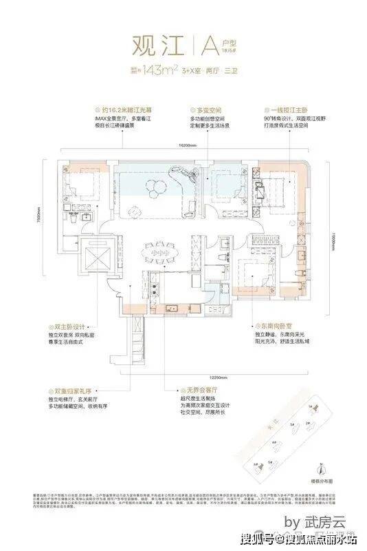 该户型三面采光,三开间朝南,带独立电梯前室,270度观江,设计非常有想象力。