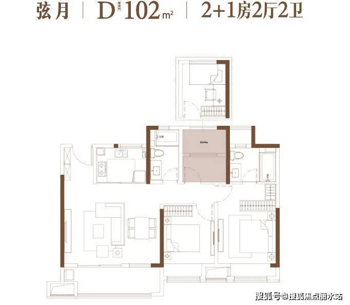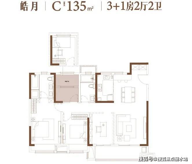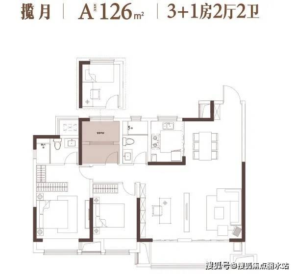 建面约126㎡,四室两厅两卫:与126㎡户型格局相近,大横厅同样也可以随着家庭需求变化。主卧进一步升级,预留了双台盆和浴缸位置。