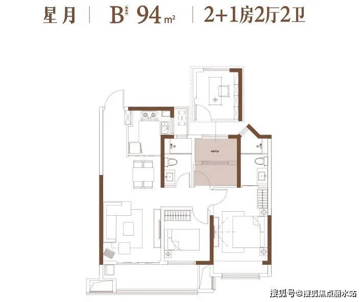 建面约94㎡,三室两厅两卫:三开间朝南的方正户型,南向双阳台,主卧套房设计并且有全尺度飘窗,空间感不错,很适合刚需人群。