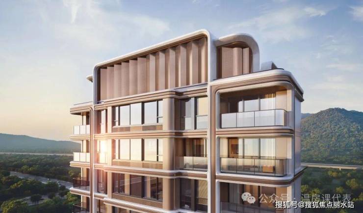 现代海派的极简建筑立面,汲取瓯江灵韵,以流线型曲线轮廓和层叠的波浪结构,彰显国际审美与东方韵味。香槟金冠顶、腰线、竖线条凝练摩登轮廓,大面积通透玻璃以“无界美学”意境,重塑龙湾天际线。