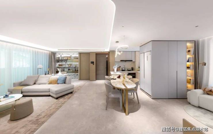 与以人为本的 LDKB一体化家庭聚场设计,将厨房、餐厅、会客厅、兴趣空间等分区融合互通,为家庭创造更多丰富情境。