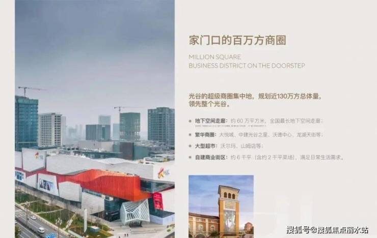 自带约6千平花园商业街区(含2千平菜场),满足日常需求。不到10分钟车程可以到达:中粮大悦城、中建光谷之星、沃德中心、地下空间走廊(在建中)、龙湖天街(规划中)、绿地(规划中)、瑞安(规划中)等约130万方商业体。驱车约15分钟,可到达:山姆华中旗舰店、奥特莱斯。