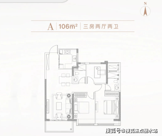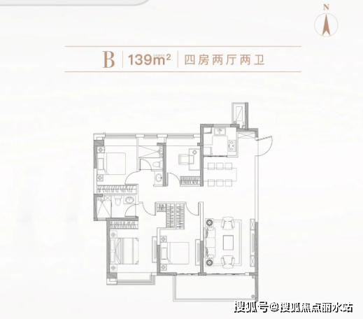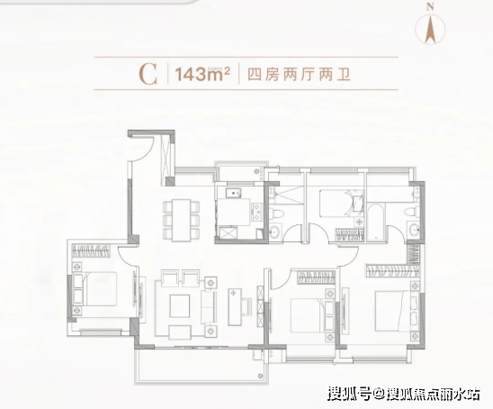 户型有4种,分别为106m²(三室两厅两卫)、139m²(四室两厅两卫)、143m²(四室两厅两卫)、170m²(双套房,四室两厅三卫)。