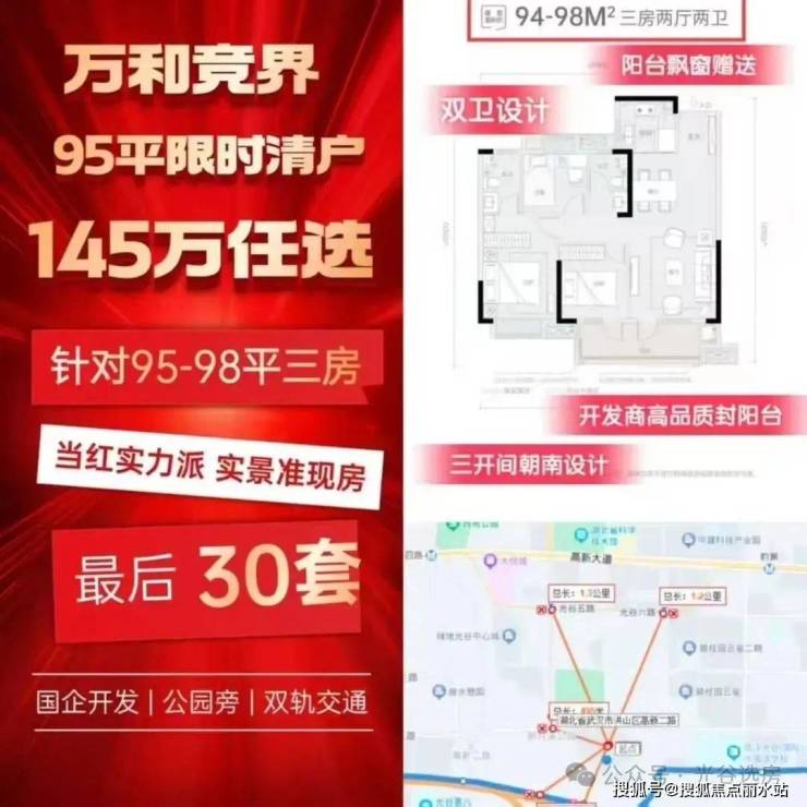 最新消息:现在小户型限时清户,建面约95-98平的三房产品,总价145万任选。单价约1.5万/平,目前在售95-142平的三房四房产品。(具体价格以案场为准)