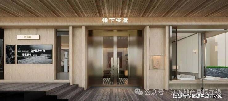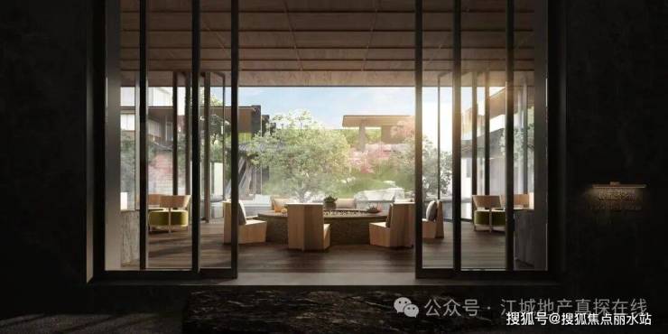【心流盒子】:整个茶室空间由木材质进行包裹,天花木格栅造型延伸至墙面,打造出立于庭院旁的独特“木质盒子”。推开茶室折叠门,中心庭院的景观一览无余,示范区旖旎风光亦能尽收眼底。