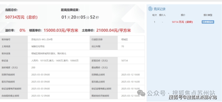 绿城宸庐,即苏地2025-WG-Z04号地块,位于相城区高铁新城民乐路东、陶村街北,是2025年3月12日,苏州宏腾&江苏汇欣鑫以5.53亿的总价竞得,成交楼面价15828元/平,溢价率5.52%。