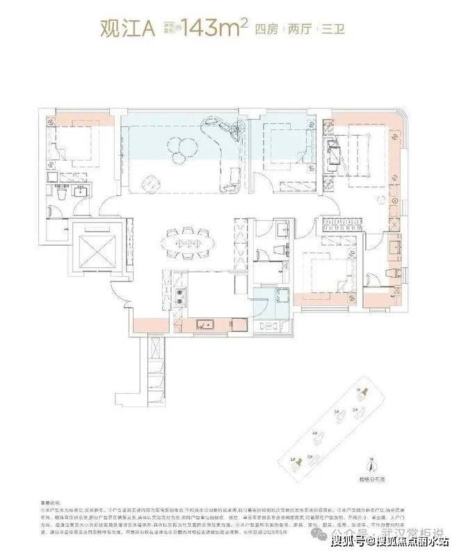 建面约143㎡是3+X户型,约16.2米极致正观江面,客厅、次卧、双主卧都能享受视觉盛宴,东侧主卧还坐拥双面观江视野。