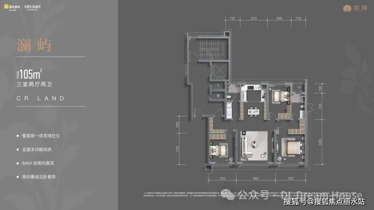 105平,小高17层,一梯两户,三室两厅两卫,层高3米,得房率约95%。