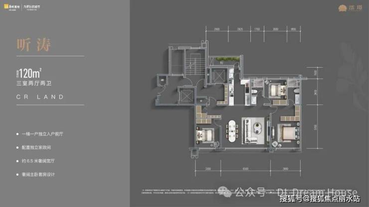 120平,小高17层,一梯一户,三室两厅两卫,层高3.1米,得房率约100%。