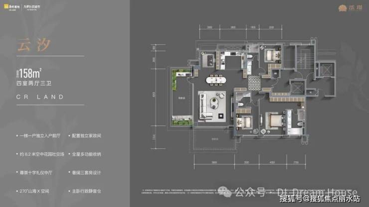 158平,小高17层,一梯一户,四室两厅三卫,层高3.1米,得房率约118%。