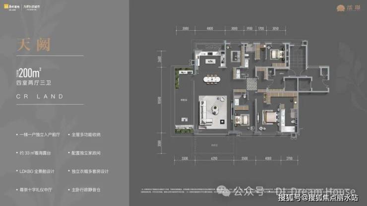 200平,小高17层,一梯一户,四室两厅三卫,层高3.15米,得房率约120%。