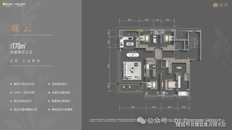 170平,洋房8层,一梯两户,四室两厅三卫,层高3.2米,得房率约115%。