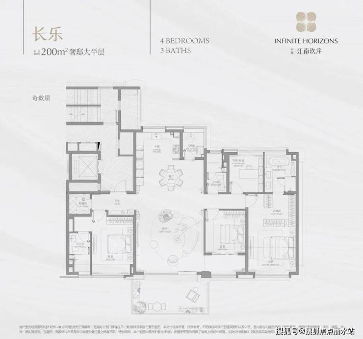 整体布局思路和建面约200㎡户型类似,在此基础上拥有了更为阔绰的双套房和北侧多功能休闲阳台配置。
