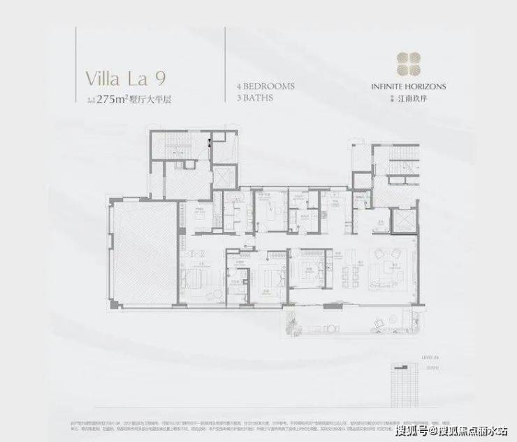 建面约305㎡户型同样拥有约6.6米挑空露台,端厅三面采光设计、超级主卧套都是这个户型的亮点。该户型的露台可欣赏小区中央景观,视野极佳。