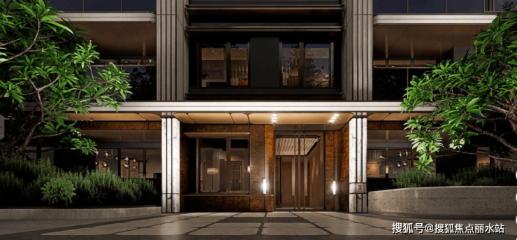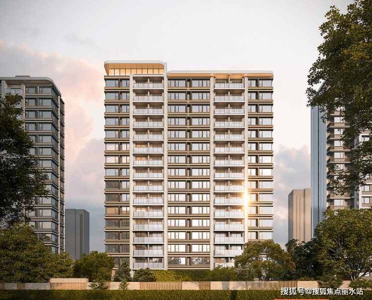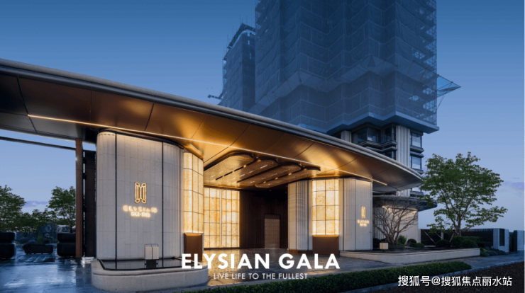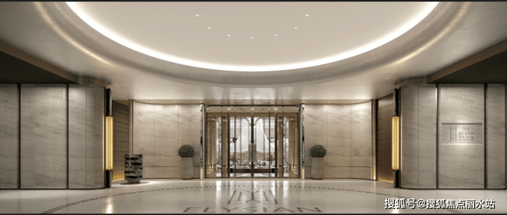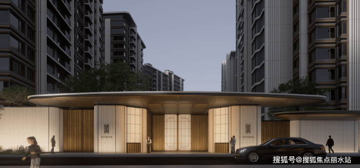 社区大门的优美的建筑弧度,来源于希腊One&Only 的唯逸度假酒店,让建筑犹如灵动飘逸的缪斯裙摆;在材料色调上,集萃上海文脉的“摩登金”,映射了十里洋场的复古韵味,与贝金米黄、香槟玉石等天然奢石 交相辉映,形成温润而精致的美学触感。建筑立面在温润放松与精致摩登之间取得完美平衡,以微弧元素为母题,致敬上海artdeco摩登气质,采用米白色与金色等温暖色彩的材料与去棱角化的造型设计创造温润如玉的立面印象。