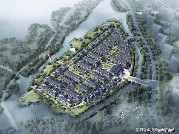 根据规划,项目拟建20栋3F联排和合院低密度住宅区,鸟瞰效果图看上去颇有世外桃源之感。