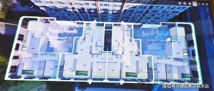 建面约115平的边套三房:分布在1号楼端头边户,3个卧室朝南,餐客厅一体全景舱设计,带独立电梯前室。