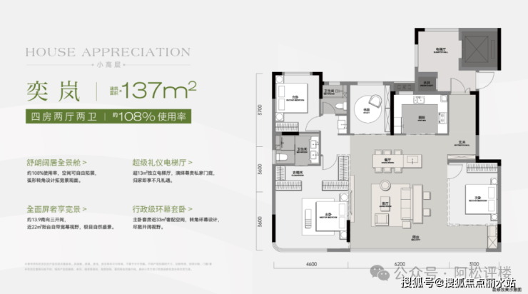 2号楼东边户,南北通透,三开间朝南,该户型带独立电梯前室,优化后约108%使用率,主卧做了弧形落地窗。户型尺度很大,餐客厅一体化方厅,主卧面积也非常大。