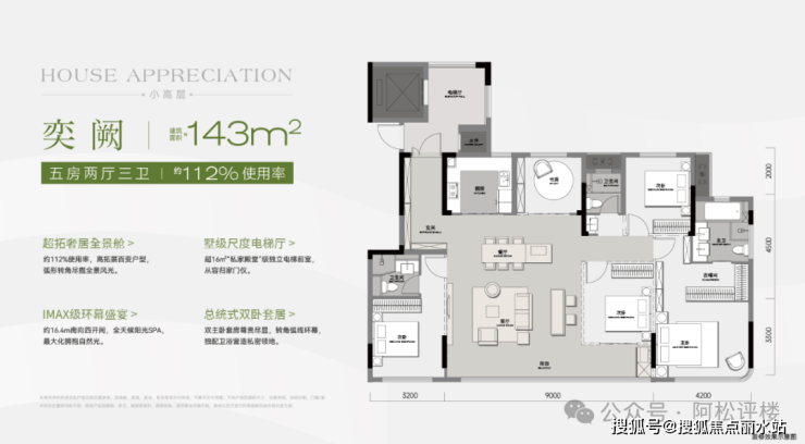 3、4号楼东边户,非首开楼栋户型,南北通透,四开间朝南,建面约143平做五房三卫,妥妥的空间越级。据户型图显示,该户型优化后约112%使用率,南向两个卧室带独立卫生间,不过有一个次卫是暗房,整体来说,主卧、客厅尺度都非常大,这个面积能做到五房也相当难得,户型设计不错。