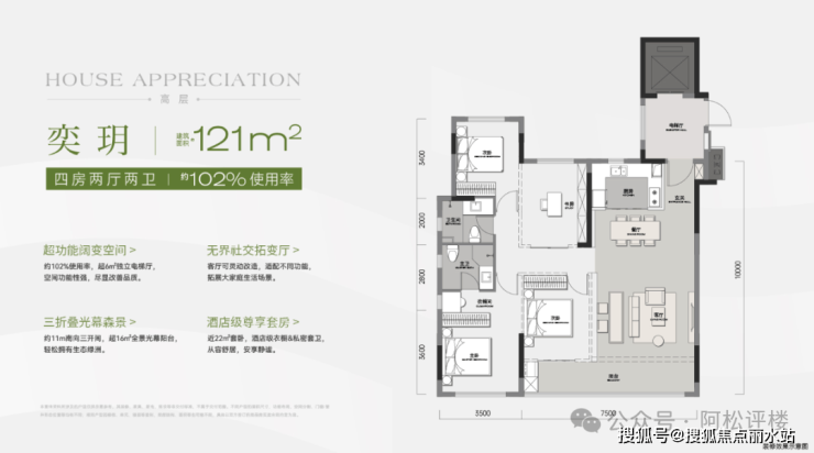 1号楼端头边户,南北通透,三开间朝南。该户型带独立电梯前室,南向大阳台,优化后约102%使用率;建面约121平四房设计,功能性强;而且还可以三房、四房之间切换。