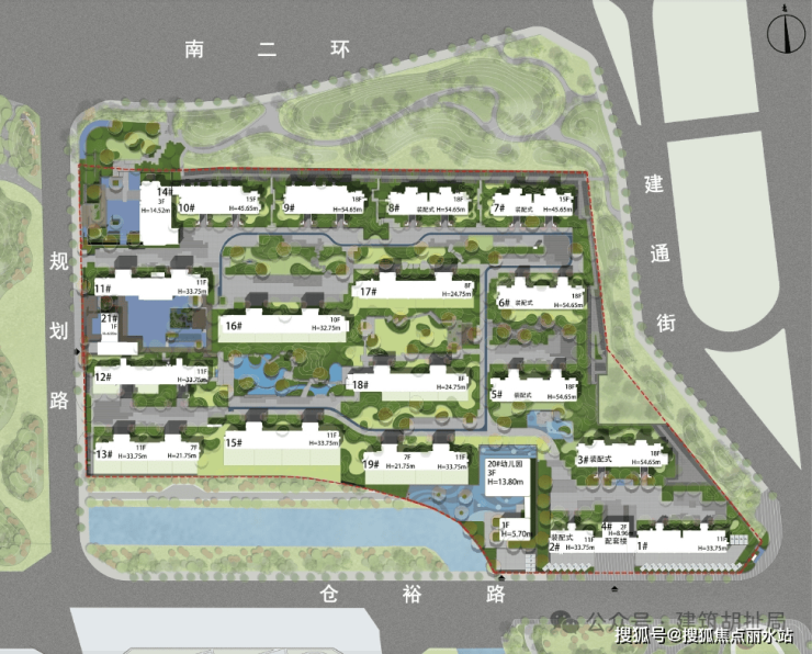 刚才说到了小区离南二环、建通街太近,可能有噪声,所以规划上就在北边和东边规划了高层住宅,作为屏障,隔绝噪声。内部全是洋房,这也算一种应对策略吧。